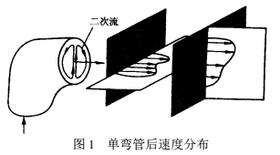 流體流過彎管由于離心力作用,靠外壁產生擴散效應,內壁產生收縮效應,由此產生橫向流動的二次流,引起下游產生速度分布畸變,如圖1所示。圖1中,右邊垂直剖面彎管外緣流速較快,水平剖面呈雙峰值流速分布。隨著液流離開彎管距離增加.畸變會趨于緩和。