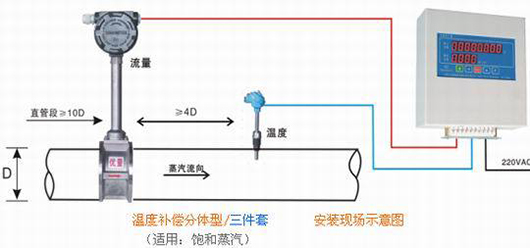 2、溫度補償一體型渦街流量計還帶有溫度傳感器,可以直接測量出飽和蒸汽的溫度并計算出壓力,從而顯示飽和蒸汽的質量流量。