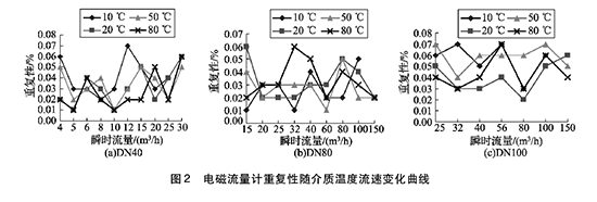 將實驗測得的管道污水處理進出水口流量計在不同溫度及流速下的重復性數據整理,特性曲線如圖2所示,3組曲線分別對應DN40, DN80, DN100的3塊管道污水處理進出水口流量計的重復性曲線。