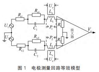 提出在硬件電路上加入模擬開關, 干擾尖峰到來時斷開模擬開關避免干擾進入后級電路,尖峰過去重新打開模擬開關;K.Saito 等提出漂移校正法,先以高勵磁頻率進行勵磁,在勵磁過程中插入低勵磁頻率提取用于漂移校正的非固定微分噪聲分量,但在插入的低勵磁頻率段漿液噪聲較大且很難將漿液噪聲與流量信號分離,此時的校正因子非單純的非固定噪聲分量,改進措施是長時間取平均值得到穩(wěn)定因子。 傳統(tǒng)方法是同步采樣保持法,即在磁場穩(wěn)定階段采樣。 其他消除干擾的方法有設置干擾補償機構、控制勵磁電流變化率減小干擾幅值、矩形波代替梯形波、希爾伯特黃變換結合傅里葉變換和程控增益技術等。經(jīng)上述對現(xiàn)有的文獻分析與總結可知, 當前消除微分噪聲主要從信號處理方面入手,并未對影響噪聲的因素加以研究。 本文建立電極測量回路等效模型,給出仿真模型搭建、參數(shù)取值和仿真結果分析。
