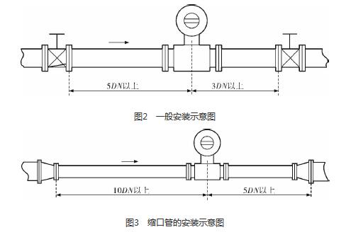 油田污水流量計廠家的安裝質(zhì)量對其測量結(jié)果的影響較大,因此在安裝時需要注意幾個問題。*先,油田污水流量計廠家直管段的選擇在配管時一定要按照要求進(jìn)行選擇,一般選擇流量計通徑與工藝管道通徑相同,即可滿足工程需要,而且安裝方便、壓力損失小,流量計直管段上游側(cè)的長度不少于5倍工藝管道直徑,下游側(cè)的長度不少于3倍工藝管道直徑(圖2)。但在流速太慢而又要求精度較高或需要變徑的應(yīng)用場合,可選擇通徑小于工藝管道通徑的流量計,以提高測量精度,此時流量計上、下游必須加裝異徑管,且進(jìn)口異徑管上游側(cè)應(yīng)有長于10倍工藝管道直徑的直管段,下游側(cè)應(yīng)有長于5倍工藝管道直徑的直管段(圖3)。