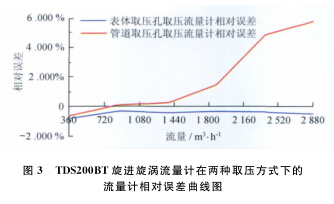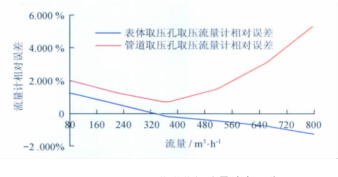 從以上數(shù)據(jù)表和曲線圖中可以看出:空氣流量計(jì)型號一定的情況下,用表體取壓孔取壓方式檢定流量計(jì)時(shí)流量計(jì)的線性度較好,用管道取壓孔取壓方式檢定流量計(jì)時(shí)流量計(jì)的線性度較差;流量測點(diǎn)相同的情況下,表體取壓孔取壓檢定方式的流量計(jì)誤差較小,管道取壓孔取壓檢定方式的流量計(jì)誤差較大;兩種取壓方式引起的誤差隨著流量的增大而逐漸增大,在流量為2 900m3/h時(shí)兩者相差近6.2%,遠(yuǎn)遠(yuǎn)超出了流量計(jì)的準(zhǔn)確度等級。所以,在空氣流量計(jì)的檢定過程中,應(yīng)避免在流量計(jì)表體取壓孔以外的地方取壓進(jìn)行檢定。