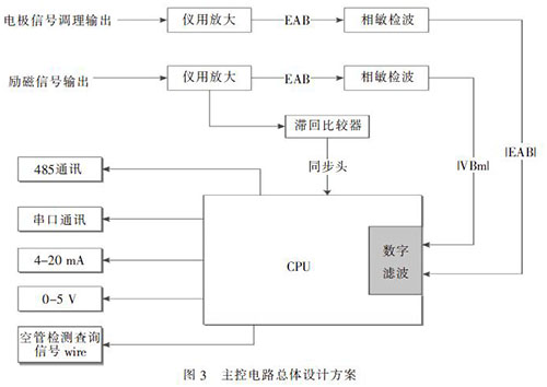 電極檢測(cè)出的微弱感應(yīng)電動(dòng)勢(shì)E, 先經(jīng)前置放大器的放大和噪聲抑制而成為大幅度低阻抗的電壓信號(hào)。此信號(hào)經(jīng)相敏檢波后,給CPU 進(jìn)行數(shù)字濾波、處理和控制,通過利用雙線性變換法將模擬的二階巴特沃斯低通濾波器轉(zhuǎn)換為數(shù)字式濾波器,既簡(jiǎn)化電路設(shè)計(jì),且可靠性高、穩(wěn)定性好。通過編寫軟件CPU 能對(duì)放大器的溫度漂移及零點(diǎn)漂移給予補(bǔ)償, 并在測(cè)量的全量程范圍內(nèi)分10 段對(duì)信號(hào)進(jìn)行非線性修正,使得測(cè)量值更好地?cái)M合真實(shí)數(shù)據(jù)??展軝z測(cè)電路上,CPU 作為從控制器。當(dāng)主控制電路上發(fā)出空管檢測(cè)查詢信號(hào)wire, 從控制器進(jìn)行識(shí)別后接收并判斷出查詢什么信號(hào),然后產(chǎn)生應(yīng)答信號(hào)上傳至主控芯片輸出顯示;當(dāng)檢測(cè)為空管信號(hào)時(shí), 從CPU 發(fā)出的zero 信號(hào)通過控制MOS 管開關(guān)來(lái)關(guān)斷流速輸出。在應(yīng)用中,對(duì)于微弱信號(hào)的放大及提取還需注意PCB 板設(shè)計(jì)時(shí)EMI 電磁屏蔽考慮,屏蔽來(lái)自空間磁場(chǎng)的干擾、周邊設(shè)備的輻射造成的干擾和板內(nèi)之間的干擾,如數(shù)模分離、強(qiáng)弱電分離等等。