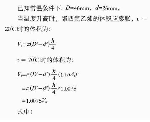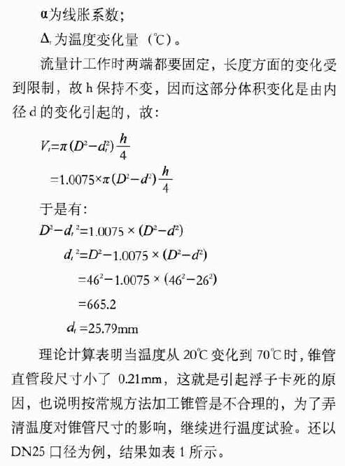 為了保持聚四氟乙烯零件尺寸的穩定性,規定其溫度應用范圍是70℃以下。在試制的初始階段,用常規加工方法,即按圖紙尺寸進行錐管和浮子的加工,可以發現,在常溫下工作正常的浮子在高溫試驗中出現了卡死現象,反復的試驗都得到同樣的結果。實際測量表明:浮子尺寸變化不大,因此推斷是由于錐管尺寸的變化引起卡死現象。通過理論計算,得出結論,以利改進。