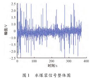 針對污泥計量表測量水煤漿時出現較大波動,甚至回零這一問題,特去某煤化工企業甲醇分公司進行現場數據采集。該公司所使用的對置式四噴嘴氣化有4個噴嘴,噴嘴管道口徑為125mm,管中水煤漿流量基本穩定在19m³/h(流速約為0.48m/s)。每條噴嘴煤漿線上安裝了3臺污泥計量表,每臺污泥計量表由傳感器和變送器兩部分組成。選擇其中1條水煤漿管線上的1臺污泥計量表進行數據采集,因為該臺污泥計量表測量結果波動大,甚至出現回零的現象。將課題組研制的基于DSP的電磁流量變送器的信號線和勵磁線接到該電磁流量傳感器的電極和勵磁線圈上,組合成完整的污泥計量表,進行水煤漿數據采集。使用的電磁流量變送器是以TI公司DSP芯片TMS320F28335為核心,采用高頻勵磁方案,其硬件主要包括勵磁控制系統和信號采集處理系統,具體的模塊有勵磁驅動模塊、信號調理采集模塊、信號處理控制模塊、人機接口模塊、通信模塊及電源管理模塊。信號調理采集模塊中的調理電路對一次儀表輸出的信號進行放大和濾波,截止頻率是2kHz,放大倍數約為230倍。通過NI公司USB-6216型號的數據采集卡進行數據采集,把調理電路的輸出端連接到數據采集卡的一個差分輸入端,并設置數據采集卡工作在差分的測量模式,設置采集卡的采樣頻率為10kHz。采集多組水煤漿信號數據,每組數據的時間長度為5min。