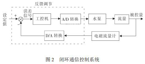 通信控制系統由工控機、變頻器、水泵、數據采集卡、化工污水流量計等組成。在整個熱量表耐久性試驗裝置中,化工污水流量計與被試驗熱量表串聯在試驗管路中。系統設定流量值 qs,通過工控機發送信號給變頻器,來控制水泵運轉,系統通過研華數據采集卡 PCI1711 將采集到的化工污水流量計當前瞬時流量值反饋給工控機,工控機將返回流量值與設定流量值qs進行比較,從而確定是否需要重新調整變頻器頻率控制水泵轉速。此過程是一個完整的閉環 PID 控制過程,其閉環控制過程如圖 2 所示。 2. 2 管路切換系統管路切換主要由冷熱水箱、水泵、開關閥等組成。要實現熱量表耐久性 4000 次冷熱沖擊試驗,需要實時控制管路中熱水與冷水的交替使用。