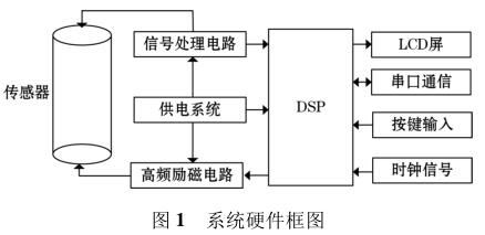 高頻勵(lì)磁管道流量計(jì)由傳感器、高頻勵(lì)磁電路、信號(hào)處理電路等組成,其中高頻勵(lì)磁電路決定著傳感器磁場(chǎng)的強(qiáng)弱,勵(lì)磁電路的穩(wěn)定性以及精確性決定著系統(tǒng)檢測(cè)的準(zhǔn)確性以及穩(wěn)定性。DSP 系統(tǒng)控制勵(lì)磁電路激勵(lì)傳感器線圈,當(dāng)線圈中有導(dǎo)電液體流過時(shí),其切割磁感線并在傳感器兩端的線圈上產(chǎn)生感應(yīng)電動(dòng)勢(shì),利用信號(hào)檢測(cè)電路監(jiān)測(cè)感應(yīng)電動(dòng)勢(shì)的大小,*后根據(jù)相應(yīng)關(guān)系計(jì)算出液體的流量,系統(tǒng)硬件框圖如圖 1 所示。