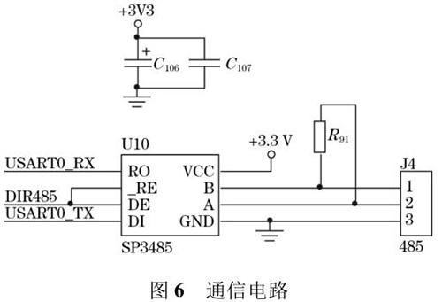 管道流量計(jì)輸出的流量值可以通過外接的 TFTLCD 屏直接顯示,還可以通過預(yù)留的 RS485 通信接口將數(shù)據(jù)發(fā)送到上位機(jī)中。RS485 電路*大的優(yōu)點(diǎn)是 485 電平與 TTL 電平兼容,方便與 TTL 電路相連;抗共模干擾能力強(qiáng);數(shù)據(jù)傳輸速度快,高達(dá) 10 Mbps;通信距離遠(yuǎn),*大為 1.2 km。系統(tǒng)采用 SP3485 芯片進(jìn)行數(shù)據(jù)通信,SP3485 是一款低功耗芯片且符合RS485 協(xié)議的收發(fā)器,電路圖如圖 6 所示。
