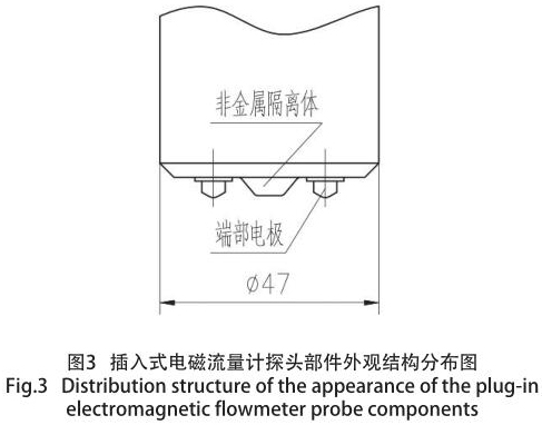 通過大量的試驗(yàn),對(duì)探頭端部外型結(jié)構(gòu)亦采用特殊設(shè)計(jì),從而消除兩個(gè)電極之間的擾流現(xiàn)象,同時(shí)亦消除因通電產(chǎn)生磁場(chǎng),導(dǎo)致兩個(gè)電極吸附介質(zhì)中的鐵屑而影響測(cè)量精度和死區(qū)效應(yīng),增強(qiáng)了輸出信號(hào)的穩(wěn)定性,從而提高傳感器準(zhǔn)確度和抗干擾性。通過結(jié)構(gòu)的優(yōu)化設(shè)計(jì),使用壽命更長,dn80泥漿流量計(jì)探頭局部,如圖 3 所示。
