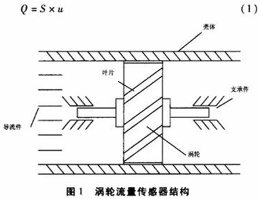 渦輪流量傳感器結構如圖1所示,屬于速度式流量傳感器。渦輪置于流體通道中,隨著流體的流動產生旋轉,設渦輪的轉速為n、流過渦輪的流體速度為u,則n與u成正比;流體通道的流通截面.積S是已知的常數,所以,流過渦輪流量傳感器的流體體積流量Q為: