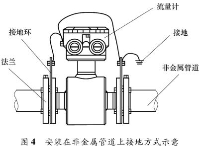液體流量計安裝在金屬管道上,安裝時將金屬管道與液體流量計相連接,接地線再接入接地網,如圖 3 所示。