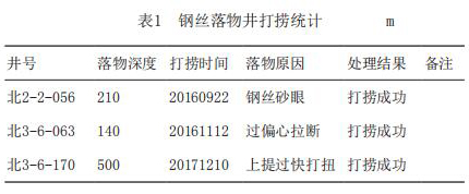 表1為一體式渦街流量計打撈統(tǒng)計表,可以看出自2016年9月開始即在現(xiàn)場進行了應(yīng)用。為了展示試驗成果的普遍性,分別從不同注入方式、不同落物深度、不同落物原因的角度,共應(yīng)用3口鋼絲落物井,打撈成功為100%。