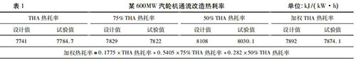 隨著火電機組利用小時數降低,發電企業一般都會根據不同負荷工況下的實際運行小時數,確定機組熱耗率考核權重,形成*終的加權熱耗率考核值。考核加權熱耗率對設備廠家末級葉片選型、高壓調門與高壓缸匹配性提出了更高的要求,在當前負荷率偏低的情況下增強了發電企業的競爭力。然而,僅僅對加權熱耗率進行考核是不夠的,設備廠家為了增強自身的競爭力,往往會把全部重點放在如何降低占比大的低負荷熱耗率上而犧牲高負荷的熱耗率,這無疑削弱了發電企業的適應性。某廠一臺 600MW 汽輪機通流改造時僅對加權熱耗率進行考核,THA 熱耗率要高出設計值43. 7 kJ/( kW·h) ,詳見表 1。通流改造時既要對加權熱耗率進行考核,也要對 THA工況時熱耗率進行考核。