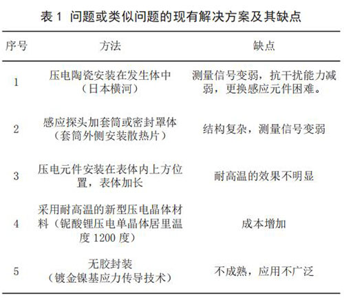 3) 當(dāng)前技術(shù)系統(tǒng)存在的問(wèn)題。 由于目前使用的傳感器檢測(cè)感應(yīng)元件為壓電陶瓷,其極化時(shí)居里溫度大約420 ~ 460℃,因此只能在低于 240℃介質(zhì)中使用,一旦被測(cè)量介質(zhì)的溫度高于 240℃,液態(tài)液化氣流量計(jì)傳感器便會(huì)因壓電陶瓷達(dá)到居里點(diǎn),絕緣電阻降低,壓電信號(hào)變?nèi)醵А?br /> 4)問(wèn)題或類似問(wèn)題的現(xiàn)有解決方案及其缺點(diǎn)(見(jiàn)表 1)。