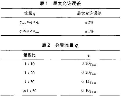 由表1可知,流量計在分界流量至*大流量之間時(q,≤q≤qmx)精度等級可達到1.0級,在*小流量和分界流量之間時(qmin≤q q1=0.20q,max