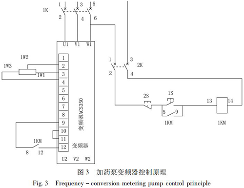 STD - Ⅲ型浮選工藝參數(shù)自動測控系統(tǒng)通過雙膜盒差壓計(jì)測量原礦漿濃度; 采用管道式流量計(jì)測量原礦漿流量,由 PLC 計(jì)算出入浮干煤泥量和藥劑的瞬時添加量,用變頻式計(jì)量泵完成浮選藥劑的添加。通過上位機(jī)還可以打印小時、班、天及月的運(yùn)行數(shù)據(jù),更加有利于生產(chǎn)管理及技術(shù)分析,藥劑自動原理如圖 2 所示,k1、k2、k3 是計(jì)算修正參數(shù)。以 PID 算法為核心,通過優(yōu)化控制程序計(jì)算出藥劑給定量,在捕收劑和起泡劑管道上分別安裝藥劑測量裝置,用于檢測藥劑的添加量。當(dāng)藥劑測量值小于藥劑給定量時,PID 輸出增大,反之則減小。加藥泵變頻器控制原理如圖 3 所示。