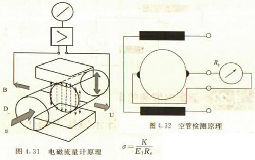 非滿管檢測也是基于電導率檢側的方法。在圖4.33所示的電磁流量傳感器中,增加了一個(或一對)非滿管檢測電極。當導管內液體滿管時,頂部電極與其他電極之間的電阻值很小;而當存在非滿管情況時,頂部電極與導電液體之間有氣體阻隔,所以電極電阻顯著增大,從而做出非滿管判斷。