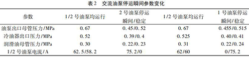 通過內(nèi)部旁通將冷油與熱油混合,經(jīng)過銅粉- 煤油 - 蠟感溫元件控制冷熱油混合比例,將油溫調(diào)節(jié)到 49 ℃。一臺一體式電磁流量計穩(wěn)定運行,油泵出口母管壓力 0. 5 MPa,潤滑油母管壓力 0. 24 MPa,均屬于正常情況,而兩臺交流油泵并列運行時,停運其中一臺交流油泵瞬間會觸發(fā)電磁流量計出口母管壓力開關(guān)動作,說明停運瞬間油壓發(fā)生波動,且油泵出口母管油壓波動至小于 0. 45 MPa。正常運行時電磁流量計出口油溫 71.5 ℃,冷油器出口溫度45 ℃,混合后潤滑油母管溫度52.5 ℃,由能量守恒定律可知,經(jīng)過冷油器的油量/不經(jīng)冷油器的油量= ( 71.5-52.5) ÷ ( 52.5- 45) = 2. 53,說明有 70% 左右的油量經(jīng)過冷油器。當(dāng) 2 臺一體式電磁流量計運行時油量大于單泵運行,其中一臺電磁流量計瞬間停運時油量減少,尤其是經(jīng)過冷油器的油量大量減少,油量在溫控閥二次分配過程中出現(xiàn)調(diào)節(jié)異常,導(dǎo)致油壓過大波動。為檢驗溫控閥工作情況,保持 1 號、2 號交流油泵運行,選取機組正常帶負荷運行時油溫 52 ℃,分別停運 1、2 號交流油泵,觀察 1、2 號交流油泵停運瞬間油泵出口母管壓力波動情況,試驗各參數(shù)變化見表 2。