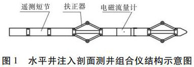 水平井注入剖面測(cè)井組合儀是針對(duì)水平井籠統(tǒng)注水井注入剖面測(cè)井專門(mén)研制的,儀器結(jié)構(gòu)如圖 1 所示。井下儀器主要包括通用短節(jié)( 遙測(cè)、溫度、壓力和 CCL) 、高壓電磁流量計(jì)和滾輪式扶正器。測(cè)量參數(shù)包括流量、溫 度、壓力、自然伽馬和深度。流量計(jì)采用的是非集流電磁流量計(jì)和集流型電磁流量計(jì),對(duì)于注入量較大的井采用非集流電磁流量計(jì),注入量較小的井采用集流型高壓電磁流量計(jì),測(cè)量方式采用定點(diǎn)測(cè)量。儀器采用遙測(cè)技術(shù)實(shí)現(xiàn)了多參數(shù)同時(shí)測(cè)量和傳輸,儀器外徑 38 mm,耐壓80 MPa,耐溫150 ℃,流量測(cè)量范圍為1 ~ 800 m3 /d,測(cè)量精度 ± 5% 。