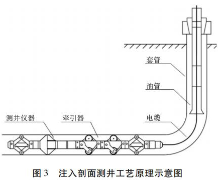 水平井注水井注入剖面測(cè)井工藝原理如圖 3 所示。在垂直井段,儀器在重力作用下可以通過(guò)注入管柱下入到井內(nèi),注入管柱下端須裝有喇叭口,且喇叭口應(yīng)在造斜點(diǎn)以上,保證測(cè)井完成后儀器順利起出,不發(fā)生卡儀器問(wèn)題。儀器通過(guò)喇叭口以后在重力作用下繼續(xù)向下移動(dòng),當(dāng)儀器不能靠重力下移時(shí),啟動(dòng)牽引器,利用牽引器將儀器推送到井底,上提電纜過(guò)程中進(jìn)行測(cè)井。