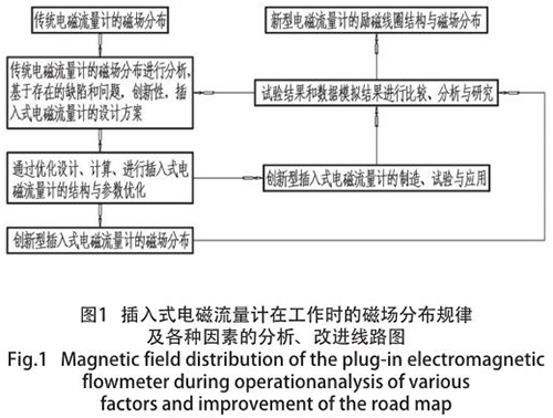 測(cè)水流量計(jì)因其特殊的結(jié)構(gòu)形式,致使其抗干擾能力較弱、準(zhǔn)確度偏低以及瞬時(shí)流量波動(dòng)過大等不良現(xiàn)象,但便于安裝、造價(jià)低廉、普遍應(yīng)用于大管道等特點(diǎn)而存在。為了發(fā)揮其優(yōu)勢(shì),消除其不利因素,對(duì)其內(nèi)部結(jié)構(gòu)及其相關(guān)技術(shù)參數(shù)進(jìn)行優(yōu)化設(shè)計(jì),從而使其準(zhǔn)確度能夠達(dá)到 ±1% FS,使抗干擾能力得到極大地增強(qiáng)。本文主要通過優(yōu)化設(shè)計(jì)、選擇材料和試驗(yàn),使測(cè)水流量計(jì)的穩(wěn)定性和準(zhǔn)確度大幅度提高,并提出解決措施,對(duì)實(shí)際應(yīng)用具有參考價(jià)值。分析與研究程序圖如圖 1 所示。