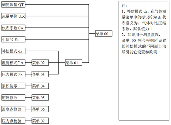 3.1、本儀表表頭采用自導(dǎo)引式和菜單式相結(jié)合的參數(shù)設(shè)置方式,所謂自導(dǎo)引式參數(shù)設(shè)置方式就是用戶在進(jìn)入菜單 00 項(xiàng)后,表頭中的微電腦會(huì)自動(dòng)導(dǎo)引用戶去設(shè)置需要設(shè)置的參數(shù)。另外,用戶也可以通過菜單模式分別對(duì)各組參數(shù)進(jìn)行設(shè)置。蒸汽測量菜單框圖如下:
