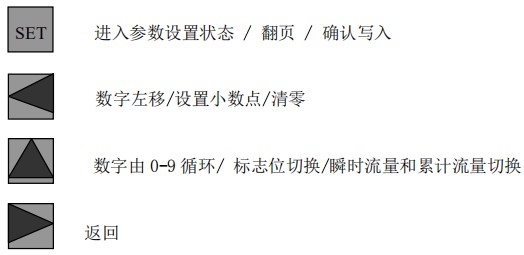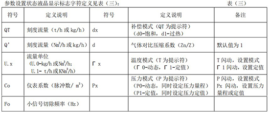 (3)標(biāo)況流量計算公式(若補償后單位為 U.0):(4)標(biāo)況流量計算公式(若補償后單位為 U.1):注:標(biāo)況指 20℃,1 標(biāo)準大氣壓三、一體化液晶顯示表頭參數(shù)設(shè)置操作說明(V03Z)1、鍵盤按鍵說明2、 顯示窗字符說明注:表中 x 代表“0”或“1”;Zn:標(biāo)準狀態(tài)下(20℃,1 標(biāo)準大氣壓),被測氣體的壓縮系數(shù),Z:工作狀態(tài)下被測氣體的壓縮系數(shù)3、 操作說明3.1、本儀表表頭采用自導(dǎo)引式和菜單式相結(jié)合的參數(shù)設(shè)置方式,所謂自導(dǎo)引式參數(shù)設(shè)置方式就是用戶在進入菜單 00 項后,表頭中的微電腦會自動導(dǎo)引用戶去設(shè)置需要設(shè)置的參數(shù)。另外,用戶也可以通過菜單模式分別對各組參數(shù)進行設(shè)置。蒸汽測量菜單框圖如下:3.2、參數(shù)設(shè)置約定:在設(shè)置各項參數(shù)時,提示符閃動代表該項參數(shù)沒有設(shè)置完或者尚未確認,可以通過按SET 鍵來確認或者按→鍵退出;提示符不閃動代表該項參數(shù)已設(shè)置完并確認,此時可以通過按 SET 鍵翻頁或者按→鍵退出。進入?yún)?shù)設(shè)置時,需要輸入密碼(6 位)并確認進入,為了防止誤進入?yún)?shù)設(shè)置菜單,保證儀表正常工作,在設(shè)置密碼時,使用↑鍵調(diào)數(shù)時不能循環(huán)調(diào)數(shù),只能單次調(diào)數(shù),只有密碼輸入正確進入各項參數(shù)設(shè)置菜單后才可以對各位循環(huán)連續(xù)調(diào)整數(shù)據(jù)。3.3、儀表參數(shù)設(shè)置舉例:儀表出廠前各項參數(shù)已設(shè)置好,用戶無需設(shè)置。如果用戶需要設(shè)置某項參數(shù),請參照以下步驟,例如修改刻度流量值 QT:在工作狀態(tài)下,按 SET 鍵,顯示屏顯示 P,數(shù)字位為全零,8 秒鐘若無操作,自動返回工作狀態(tài)。輸入密碼 :按數(shù)字↑鍵和左移←鍵,輸入密碼數(shù) xxxxx(出廠時默認密碼為 000123),↑鍵調(diào)各位數(shù)字 0-9,每按 ←鍵一次數(shù)字向右循環(huán)一位,可通過多次按←鍵對整段數(shù)字清零,按→鍵可以返回工作狀態(tài)。菜單選擇項:按 SET 鍵確認,顯示屏顯示如右圖所示,末行“00”閃動調(diào)整該項值選擇不同參數(shù)設(shè)置菜單。該例直接按 SET 鍵進入菜單 00 項設(shè)置刻度流量:QT 閃動,*一步:*先進行小數(shù)點調(diào)整,可以通過←鍵對參數(shù)快速清零或者通過↑鍵進行小數(shù)點調(diào)整,調(diào)整完畢,按 SET 鍵確認(QT 仍閃動);*二步:數(shù)值調(diào)整,可以通過↑鍵對每位數(shù)字進行調(diào)整,按 ←鍵一次數(shù)字向右移動一位,調(diào)整完畢,按 SET 鍵確認,QT 停止閃動,該項參數(shù)設(shè)置完畢,可進行下一項參數(shù)設(shè)置或者退出另外,單位設(shè)置 U.X 和補償方式設(shè)置 dX 通過↑鍵調(diào)整修改。3.4、校驗項說明: 儀表出廠前,溫度和壓力通道已校驗設(shè)置好,無需用戶重新校驗。校驗通道有密碼保護,廠家不對外開放,如果需要重新校驗溫度或者壓力通道,請專業(yè)人員與廠家技術(shù)人員聯(lián)系。4、計算公式說明4.1、蒸汽測量計算公式(1)渦街流量儀表工況體積流量計算公式:(2)密度 d,單位 Kg/m3(3)質(zhì)量流量計算公式,單位 Kg/h:(4)質(zhì)量流量計算公式,單位 t/h:4.2、氣體測量計算公式----標(biāo)況指 20℃,1 標(biāo)準大氣壓(1)渦街流量儀表工況體積流量計算公式:(2)對比壓縮系數(shù) d(Zn/Z),單位 1(3)標(biāo)況流量計算公式,單位 Nm3/h:P1—工況絕壓,PN—標(biāo)況絕壓(Mpa),T1—工況熱力學(xué)溫度,TN—標(biāo)況熱力學(xué)溫度(K)