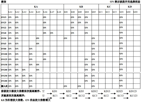 (4)標(biāo)況流量計算公式,單位 t/h:四、AMPKP09A01 放大板波段開關(guān)調(diào)整參照表五、AMPSW10A01 放大板波段開關(guān)調(diào)整參照表RG=1-F 調(diào)放大器增益,由 1 至 F 依次增大(常用 4-8);RS=1-F 調(diào)觸發(fā)靈敏度,由 1 至 F 依次提高(常用 4-8)不同口徑和介質(zhì)開關(guān)選擇參見附表。并根據(jù)實際信號先調(diào)整 K2 和 K3 擴展頻帶,必要時調(diào)整 K1 電荷放大器增益以上表值僅供參考,實際使用中因液體粘度和氣體密度不同應(yīng)在此值附近調(diào)整,頻率低時可將 K3 向大口徑方向調(diào)一至三檔。頻率高時可將 K2 向小口徑方向調(diào)一至三檔。訂貨須知及選型樣譜一.尊敬的用戶,當(dāng)您要選用本公司產(chǎn)品時,請仔細閱讀選型樣本,并做好以下工作:1.認真核對被測介質(zhì)的工況條件:溫度、壓力、管徑等工藝參數(shù)。2.認真核對被測介質(zhì)的使用流量范圍,特別是*小流量值以*終確定使用儀表的口徑及配管參數(shù)。3.確定儀表的安裝地點,保證直管段,并為儀表的安裝維護創(chuàng)造好的環(huán)境條件。4.填好訂貨咨詢單,見附表三二.渦街流量儀表選型表(符合 JB/T9294-1999 標(biāo)準)1.傳感器選型表上一篇:污水流量計的種類