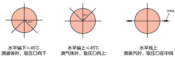 2、測氣體時,為防止液體進入導壓管,取壓口方向應處于水平線上偏45度的位置以內(nèi),正、負取壓口在同一水平面上。