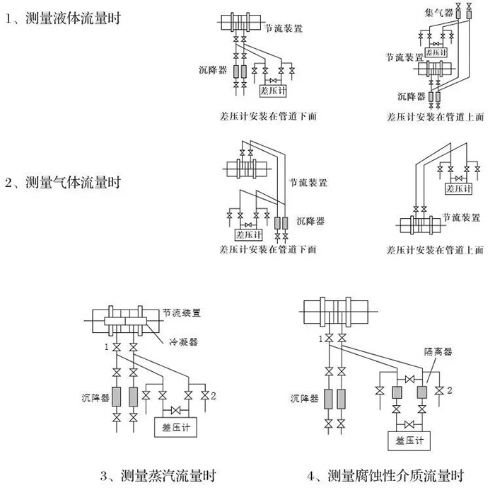 根據(jù)被測介質(zhì)的性質(zhì)、節(jié)流裝置與差壓計的相對位置,差壓信號管路可有以下幾種安裝方式: