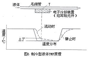 液體用tmf 在20世紀(jì)90年代初中期開始發(fā)展并在工業(yè)生產(chǎn)中應(yīng)用,但當(dāng)前主要為微小流量?jī)x表。有消耗功率測(cè)量法的熱分布式tmf和利用珀?duì)柼? peltier)致冷元件在檢測(cè)部位致冷(即附加熱)的tmf。后者的測(cè)量原理如圖6所示,流量傳感器由測(cè)量毛細(xì)管、電子冷卻裝置(珀?duì)柼?和3各溫度檢出件組成。測(cè)量管和致冷元件接觸,無(wú)液體流動(dòng)時(shí)冷卻到某一溫度時(shí),兩者溫度相等;液體流動(dòng)時(shí)致冷元件附近測(cè)量毛細(xì)管溫度上升,如虛線所示分布,測(cè)量溫度檢測(cè)點(diǎn)的兩者溫度差以求的流量。