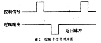 其外部特性如圖2所示。其工作原理是,每當在“控制信號”端加一正脈沖(寬度0.2ms),控制卡便通過換能器發一束超聲波,當超聲波遇被測污水反射后又被換能器接收,控制卡便通過“邏輯輸出”端輸出一“返回脈沖”。通過計量“控制信號”到“返回脈沖”之間的時間T便可按下式計算出換能器距被測污水表面的距離H,由于安裝時換能器固定在污水的上方(高度不變),因此,換能器距污水底部的距離HO(其值已知)減去H即為污水液位H1。