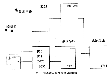 圖3中,單片機8031、74373和2764組成單片機核心電路,8255為顯示電路接口,DSl220為不揮發RAM,用其存儲流量可保證斷電后流量不丟失。工作時8031每隔一個采樣周期先啟動定時器T1,然后通過PIO引腳向控制卡發控制信號,換能器發一聲波經被測污水反射由換能器接收,控制卡的邏輯輸出端輸出一脈沖,脈沖信號經過或門進入INTO腳,引起中斷請求。在中斷服務程序中從定時器中取出定時值,計算出對應的液位。由于傳感器在發出聲波后,在4MS以內會產生無用的盲區脈沖,所以在P10向控制卡發控制脈沖的同時,通過P11引腳發一個4ms的高電平封鎖信號,防止“盲區脈沖”通過或門進入INTO引腳。