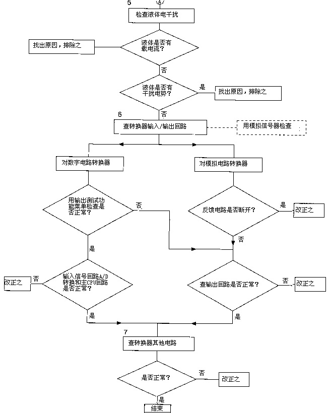 先檢查流程圖*6項,即查輸入/輸出電路。按模擬電路轉換器或數字電路轉換器兩種類型各自特點上,著重檢查幾個環節,對模擬電路轉換器應從反饋回路是否開路,輸出回路有否損壞為主;對數字電路轉換器應從ND轉換電路和輸出回路分析為主要檢查環節。