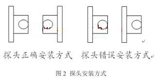 d.探頭安裝時要注意方向。該廠流量計一度頻頻歸零,起先找了很多原因,如給流量計井做防水,更換耦合劑等,但是效果并沒有大的改善。結果是雖然頻頻更換耦合劑,但二次表中信號強度*好僅能達到44dB,且信號強度不穩(wěn)定,浮動較大,導致流量不夠準確。有時甚至涂抹一次耦合劑只能正常顯示數(shù)據(jù)一天時間。后來發(fā)現(xiàn)一個探頭在兩根鋼帶內(nèi)側,另一個探頭在兩根鋼帶外側,而兩個探頭應該同在兩根鋼帶內(nèi)側,如圖2所示。錯誤安裝方式的結果是聲波信號接收效果不好。將安裝方式更改之后,信號強度*好能達到70dB,并穩(wěn)定在60-70dB之間,從而保證了流量數(shù)據(jù)的準確性。