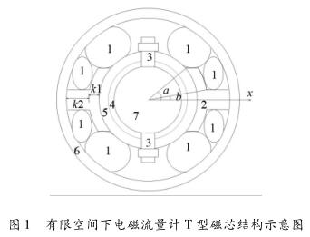 T型磁芯是為較小的空間下實現(xiàn)盡可能大的勵磁線圈而提出的,如圖1所示為較小空間結(jié)構(gòu)下,設(shè)計有T型磁芯的井水流量計傳感器截面圖。在圖中1表示線圈位置;2表示磁芯位置;3表示電極及其固定器件位置;4表示襯里位置;5表示內(nèi)徑壁位置;6表示外徑壁;7表示測量管道(測量區(qū)域)。如圖1所示井水流量計勵磁結(jié)構(gòu)磁芯造型近似為T型(因稱為T型磁芯),磁芯在靠近井水流量計內(nèi)管道時為T型磁芯的較長端。如圖中所示,T型磁芯較長端與x軸夾角為a,T型磁芯較短端與x軸夾角為b,T型磁芯較長端寬度為k1,T型磁芯較短端寬度為k2。