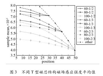 如圖3所示為不同T型磁芯結(jié)構(gòu)下測量區(qū)域產(chǎn)生磁場感應(yīng)強度平均值,圖中橫坐標(biāo)為T型磁芯b的角度,縱坐標(biāo)為測量區(qū)域的平均磁場強度,圖標(biāo)表示的是T型磁芯的不同a的角度以及磁芯長端寬度所占的比例。其中以“角度-比例”表示,例如30-1/2表示T型磁芯的較長端角度a為30°,k1/(k1+k2)為1/2時的測量區(qū)域中平均磁場強度測量結(jié)果。圖標(biāo)Other為T型磁芯較長端的角度a與較短端的角度b相等(即為23,30,35,40,45,50)時的流量計測量區(qū)域中的平均磁場強度。從仿真結(jié)果可以看出:T型磁芯的較長端的角度a越小,流量計測量區(qū)域中平均磁場強度越大;在T型磁芯的較長端的角度a一定時,T型磁芯的較短端的角度b越小,流量計測量區(qū)域中平均磁場強度越大;在T型磁芯的較長端的角度a與較短端的角度b一定時,T型磁芯的k1/(k1 + k2)越小,在流量計測量區(qū)域中平均磁場強度越大。