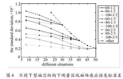 如圖4所示為不同T型磁芯結(jié)構(gòu)下測量區(qū)域產(chǎn)生磁場感應(yīng)強度標(biāo)準(zhǔn)差,圖中橫坐標(biāo)為T型磁芯b的角度,縱坐標(biāo)為測量區(qū)域磁場強度的標(biāo)準(zhǔn)差,圖標(biāo)圖例與圖3中一致。從仿真結(jié)果可以看出:T型磁芯的較長端的角度a越小,流量計測量區(qū)域中磁場強度標(biāo)準(zhǔn)差越大;在T型磁芯的較長端的角度a一定時,T型磁芯的較短端的角度b越小,流量計測量區(qū)域中磁場強度標(biāo)準(zhǔn)差越大;在T型磁芯的較長端的角度a與較短端的角度b一定時,T型磁芯的k1/(k1 + k2)越小,在流量計測量區(qū)域中磁場強度標(biāo)準(zhǔn)差越大。