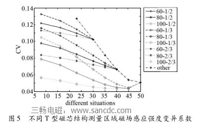標(biāo)準(zhǔn)差代表磁場測量區(qū)域的磁場分布波動性較大,因而需引入變異系數(shù)對測量區(qū)域中的磁場分布情況進(jìn)一步分析。如圖5所示為不同T型磁芯結(jié)構(gòu)下測量區(qū)域磁場感應(yīng)強度變異系數(shù),圖中橫坐標(biāo)為T型磁芯b的角度,縱坐標(biāo)為測量區(qū)域磁場強度分布的變異系數(shù),圖標(biāo)圖例與圖3中一致。從仿真結(jié)果可以看出:T型磁芯的較長端的角度a越小,流量計測量區(qū)域中磁場強度變異系數(shù)越大;在T型磁芯的較長端的角度a一定時,T型磁芯的較短端的角度b越小,流量計測量區(qū)域中磁場強度變異系數(shù)越大;在T型磁芯的較長端的角度a與較短端的角度b一定時,T型磁芯的k1/(k1 + k2)越小,在流量計測量區(qū)域中磁場強度變異系數(shù)越大。異系數(shù)越大說明磁場分布越不均勻,波動性越大;異系數(shù)越小說明磁場分布趨向均勻。下面通過計算測量區(qū)域中的磁場均勻區(qū)域來對這一結(jié)果進(jìn)一步的分析。